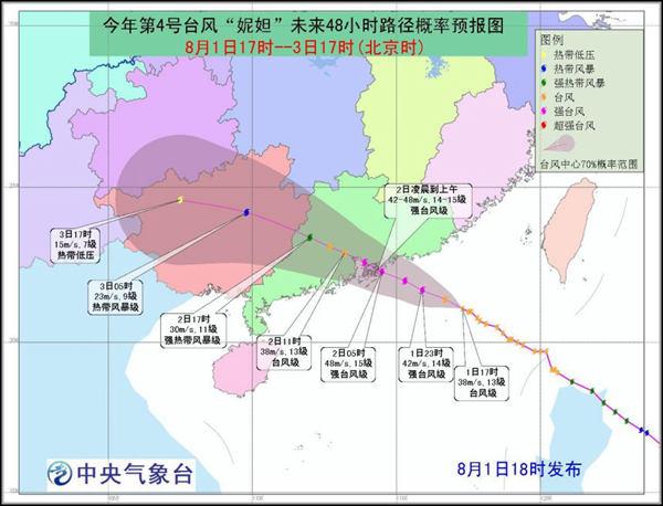 大風預報:8月1日20時至2日20時,臺灣海峽南部、南海中部偏北海域、廣東西部沿海、海南東部沿海、福建南部沿海將有7-8級大風,陣風9-10級;南海北部的大部海面、廣東中東部沿海及珠三角地區(qū)將有9-12級大風,“妮妲”中心經過的附近海面和地區(qū)風力13-15級,陣風可達16級。