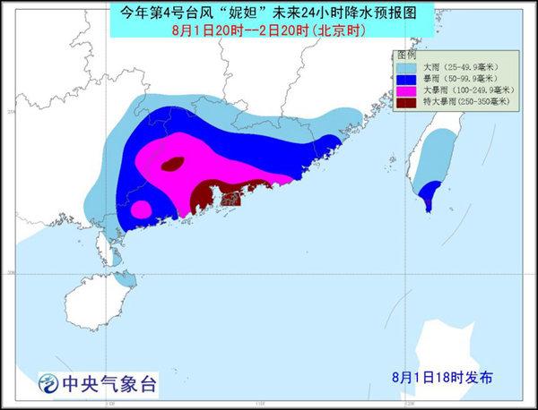 降水預報:8月1日20時至2日20時,廣東大部、廣西東部、湖南南部、福建東南部、臺灣大部、海南東北部等地有大雨或暴雨,廣東中南部、廣西東北部的部分地區(qū)有大暴雨,其中,廣東珠三角及東部沿海地區(qū)局地有特大暴雨(250~350毫米)。