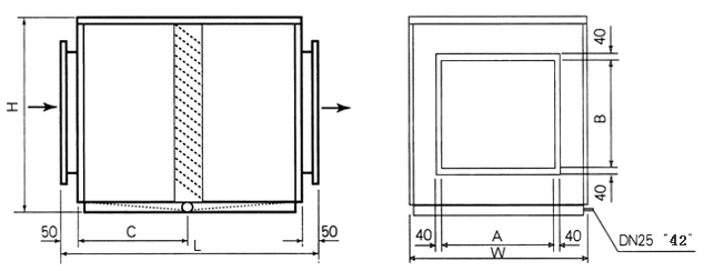 1、 風(fēng)管濕膜加濕器的風(fēng)管寬度w、高度h、風(fēng)管的進(jìn)出風(fēng)口寬度A、高度B應(yīng)視具體情況而定。 2、 A、B尺寸原則上應(yīng)根據(jù)風(fēng)道尺寸確定。 3、 W、H尺寸原則上應(yīng)根據(jù)風(fēng)道送風(fēng)量設(shè)計(jì)確定,設(shè)計(jì)時(shí)應(yīng)盡量保證濕膜的迎面風(fēng)速在2.2-2.7m/s為佳。 4、 選擇W、H尺寸還要視風(fēng)管周圍有無障礙物等具體情況合理選擇。